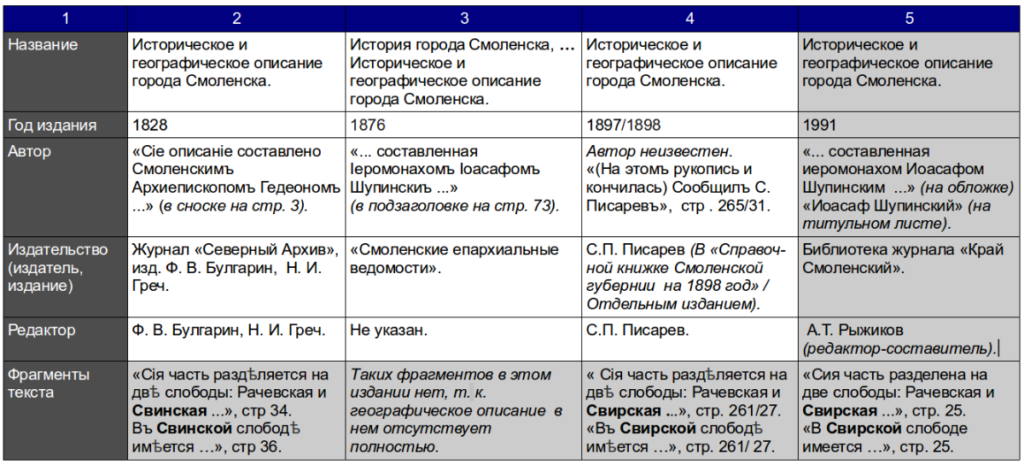 И это в какой-то степени могло сказаться также и на редакторской правке новых публикаций «Исторического и географического описания г. Смоленска» 1780 г. – см. таблицу: