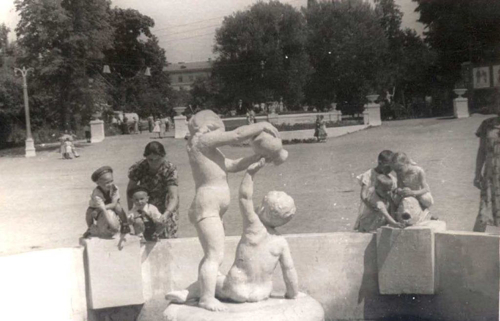 fontan-s-ribami… имел место, натурально, фонтан, в центре которого стояли вроде бы два каменных мальчика (но не «писающих», хотя и из них вверх что-то лилось), а по окружности парапета были расставлены то ли рыбы, то ли лягушки, которые из пастей на этих мальчиков испускали струи вкусной холодной воды (сам пил!).