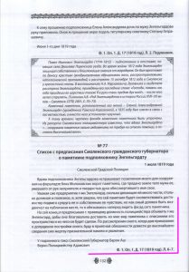 №77. Список с предписания Смоленского гражданского губернатора о памятнике подполковнику Энгельгардту, 1 июля 1819 года; стр. 132.