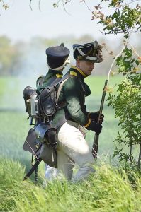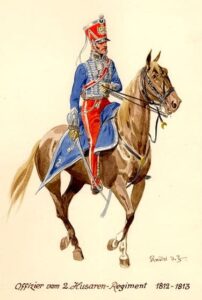 <…>Два человека скоро догнали меня, один был вооружен пикой, другой — саблей. Они кричали мне: «Postoi, Franzus!» — «Пришло время», — подумал я, выставил вперед саблю и выстрелил из пистолета по гусару с пикой. Он дал осечку, тогда я бросил его в голову лошади с такой силой, что та повернула в сторону. В другого, молодого офицера, я выстрелил из второго пистолета, но пуля пролетела мимо. Он нанес мне сильнейший удар, который я парировал, но латунная гарда моей сабли была разбита, а мой большой палец серьезно поврежден. Одновременно я получил сзади сильный укол пикой, который пришелся на кожаную обшивку моего кивера и находящуюся в нем фуражную шапку, и упал безжизненно.<…>