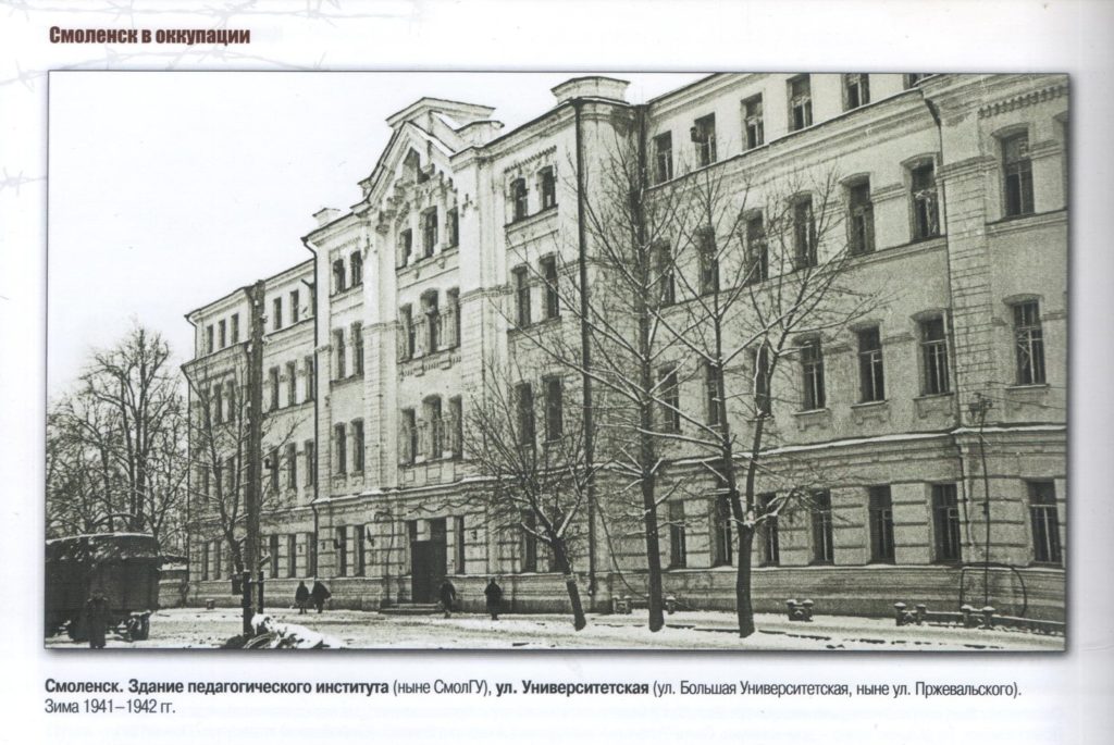 “Смоленск. Здание педагогического института (ныне СмолГУ), ул. Университетская (ул. Большая Университетская, ныне ул. Пржевальского). Зима 1941 -1942 гг.”.