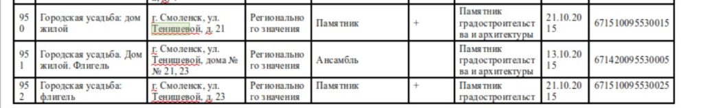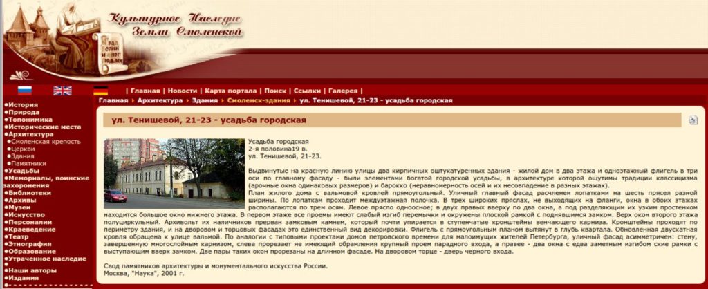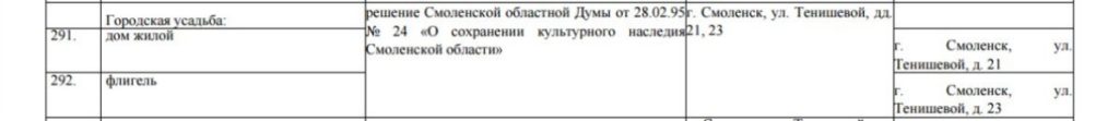 Среди объектов культурного наследия города Смоленска до наших дней сохранились городские усадьбы, расположенные по улице Ново-Рославльской, дом 3 и улице Тенишевой, дом 21, 23. …».