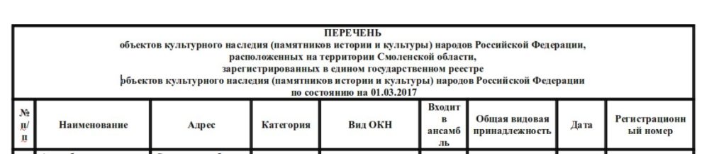 “Перечень объектов культурного наследия, находящихся на территории Смоленской области