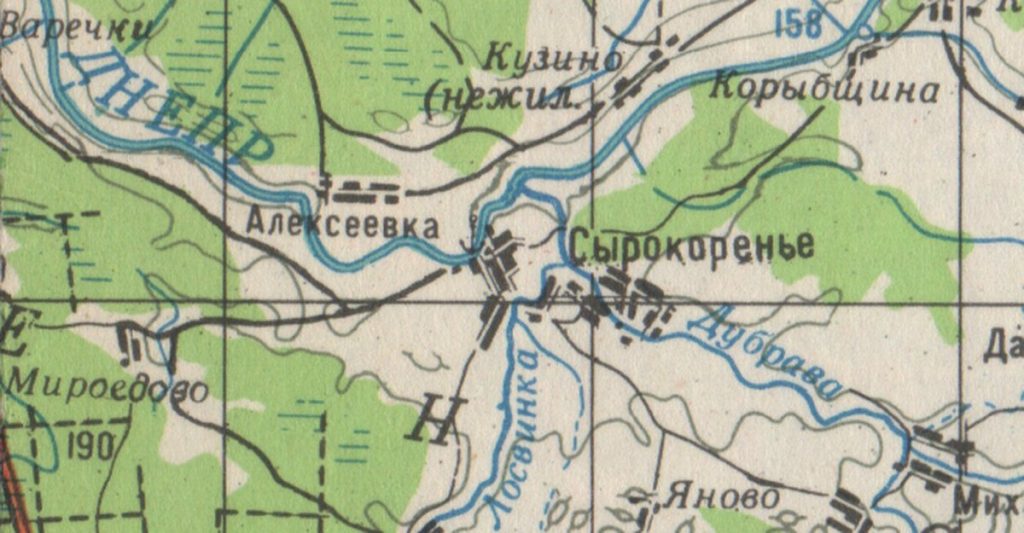 « …На речном участке от Лопина до Сырокоренья пассажиров перевозили отремонтированные пароходы «Октябренок» (80 пассажирских мест) и «Припять» (132 места). Для удобства горожан были организованы две лодочные переправы через Днепр (на Рачевке и ниже пристани), работавшие с 6 часов утра до 10 часов вечера. Подобные переправы действовали в Сырокоренье и Катыни. …».