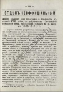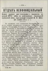 Заглавие: Новые данные для топографии г. Смоленска в начале XVII века по документам Смоленской приказной избы, при воеводе боярине М.Б. Шеине (1608-1611 г.)
