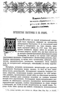 Неодноразово в нашій історичній літературі зверталася увага на подорож імператриці Катерини Великої (Другої) на південь Росії, вчинене їй напередодні турецької війни у 1787 році. Це підприємство займає чільне місце в історії східного питання, крім того воно було добою в історії адміністративної діяльності князя Потьомкіна, під час цієї поїздки удостоєного прізвиська «Таврійський». Нечувана розкіш оточувала імператрицю під час цієї подорожі зробилася предметом анекдотичних розповідей, грають настільки важливу роль у історичній літературі відноситься до цього царювання …