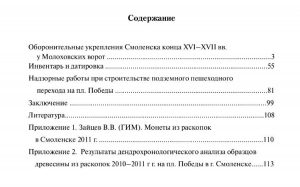 «В издании публикуются результаты спасательных археологических работ Смоленской экспедиции Института археологии Российской академии наук 2010 – 2011 гг. в районе Молоховских ворот крепостной стены г. Смоленска. В ходе проведенных археологических изысканий при строительстве подземного перехода на пл. Победы были отрыты дерево – земляные фортификационные укрепления второй половины XVI – XVII вв. – остатки деревянного тына, земляного вала, укрепленного срубными конструкциями, настилы нескольких ярусов мостовых улицы, ведущей к древним Молоховским воротам. А также дополнительные оборонительные сооружения, возведенные польским гарнизоном Смоленска в период осады города войском Алексея Михайловича в 1654 г. Получена богатая коллекция индивидуальных находок и массового материала XVI – XVII вв.