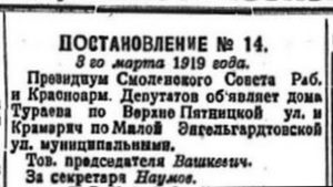 Президиум Смоленского Совета Раб. и Красноарм. Депутатов объявляет Дом Тураева по Верхне Пятницкой ул. муниципальным.