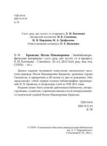 ….“Данное издание посвящено известному смоленскому писателю-краеведу Нелли Никаноровне Кравклис, уроженке города Смоленска, и приурочено к 80-летию со дня ее рождения. Оно представляет собой первую полную библиографию произведений Н. Н. Кравклис и литературы о ней за 1958-2011 годы.
