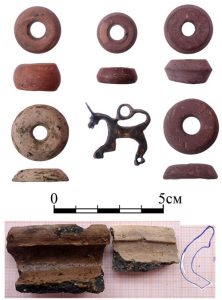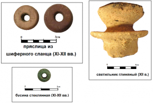 организации жилого и хозяйственного пространства жителей города в средневековье. На раскопе были обнаружены: шиферные пряслица*, фрагменты стеклянных браслетов, бусина из зелёного непрозрачного стекла, бронзовая подвеска в виде конька, глиняный светильник.