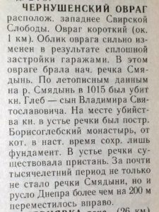 ….«Местность по Большой Краснофлотской улице к западу от мебельной фабрики имени Смолгорсовета называется Смядынью. В XII-XVII веках Смядынь играла важную роль в экономической и политической жизни Смоленска. Здесь при впадении в Днепр ныне пересохшей речки Смядыни возникла одна из самых древнейших пристаней города, а позднее и один из его посадов. …