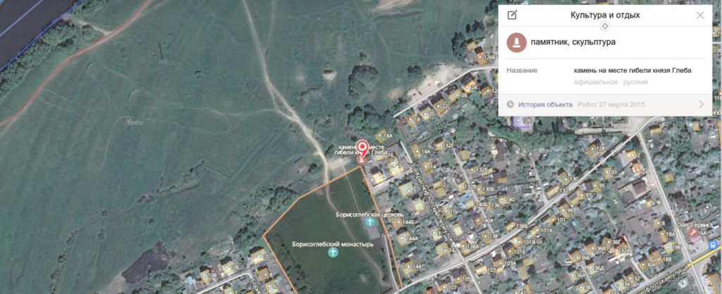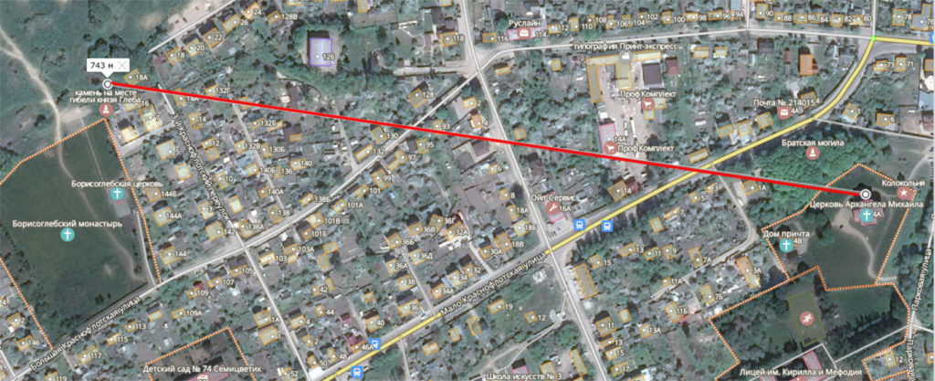 «Сергей Амелин: … Это обсуждение натолкнула на мысль, а видны ли следы речки Смядынь на аэрофотосъемке 1941 года. Похоже, что видны (в виде ручейка). И руины Борисоглебского монастыря тоже».