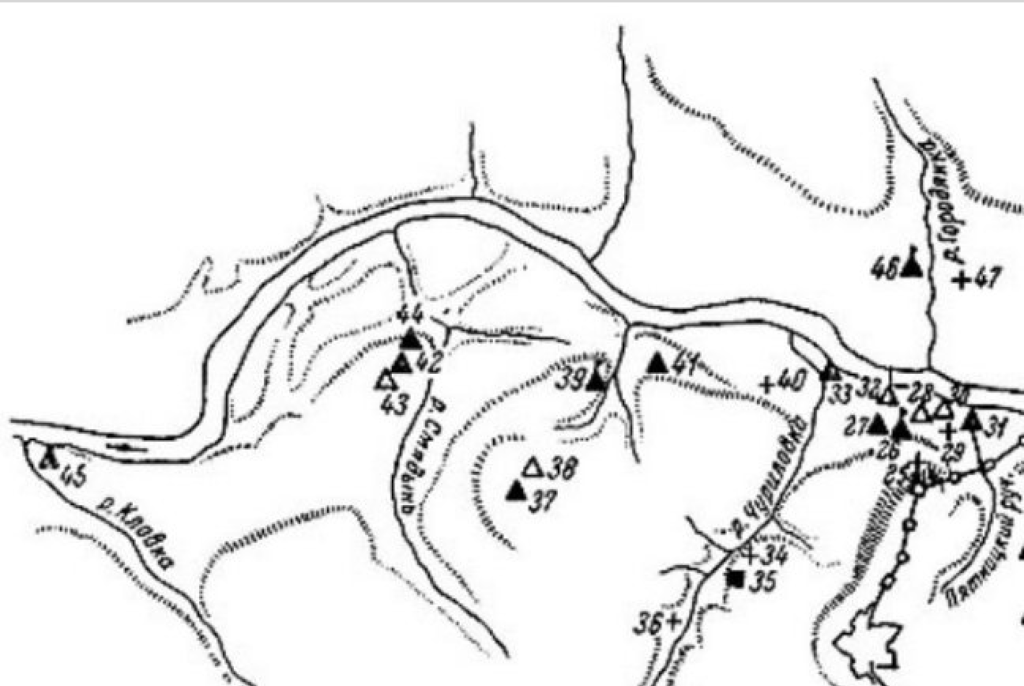 Схема расположения древних памятников (по Воронину-Раппопорту).