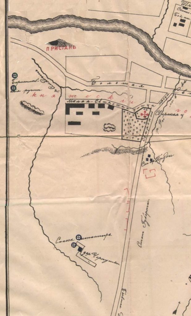 А вот на всех 4-х приведенных здесь схемах/планах сразу справа от ц. Архангела Михаила нанесена впадающая в Днепр речка с 2-мя рукавами-притоками, а на двух последних (1898 и 1905 гг.) даже подписано ее название – однако, очень плохо читабельное. 🙁