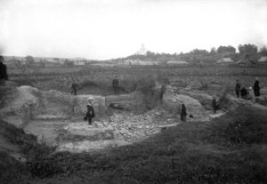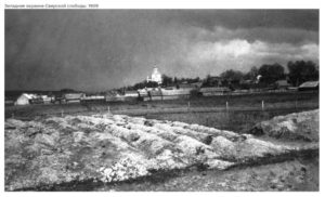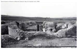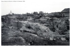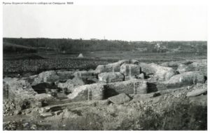 Борисоглебский собор одноименного монастыря на Смядыни – второй (после Успенского собора, заложенного в 1101 г.) каменный храм Смоленска, построенный в 1145-1150 гг. Разрушился в 17 в. На снимке – результат расчистки остатков собора, проведенной без научного сопровождения в 1907-1908 гг. “Раскоп” не был засыпан, поэтому руины храма осматривались туристами и растаскивались местными жителями на кирпич, к настоящему времени почти полностью разрушены.