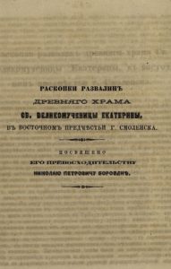 ….Раскопки развалинъ древняго храма Св. Великомученицы Екатерины, въ восточномъ предмѣстьи города Смоленска. Посвящено его превосходительству Николаю Петровичу Борозднѣ. …