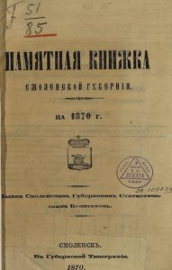 Дополнено 11.02.2017 (1):  “Это Памятная книжка за 1870 год http://dlib.rsl.ru/viewer/01003828184#?page=171“. Смоленский форум > Вехи > Карты Смоленска и региона > Стр. 16 > Индиана Джонс 27 фев 2017 19:07..