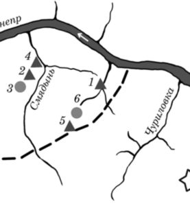 Схема расположения древних памятников (по Воронину-Раппопорту).