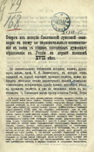 Очеркъ изъ исторiи Смоленской духовной семинарiи въ эпоху ея первоначальнаго возникновенiя въ связи съ общимъ состоянiемъ духовнаго образованiя въ Россiи въ первой половинеѣ XVIII вѣка. Л.Я. Лавровскiй.