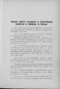 Е. Н. Клетнова. Хронологъ событiй, относящихся къ Борисоглѣбскому предмѣстью въ Смоленскѣ, на Смядыни. // Смоленская Старина. Выпускъ третiй. Часть II. Изданiе Смоленской Ученой Архивной Комиссiи. Смоленскъ. Типо-Литографiя Я.Н. Подземскаго. 1916 г. Печатано на основанiи постановленiя Смол. Уч. Арх. Комиссiи.
