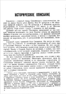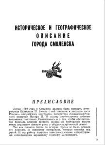 ….Полное название “Историческое и географическое описание города Смоленска” приведено также в Предисловии на стр. 3 (всего стр. 3-5), а названия соответствующих разделов: “Историческое описание” на стр .6 (всего стр. 6-18) и