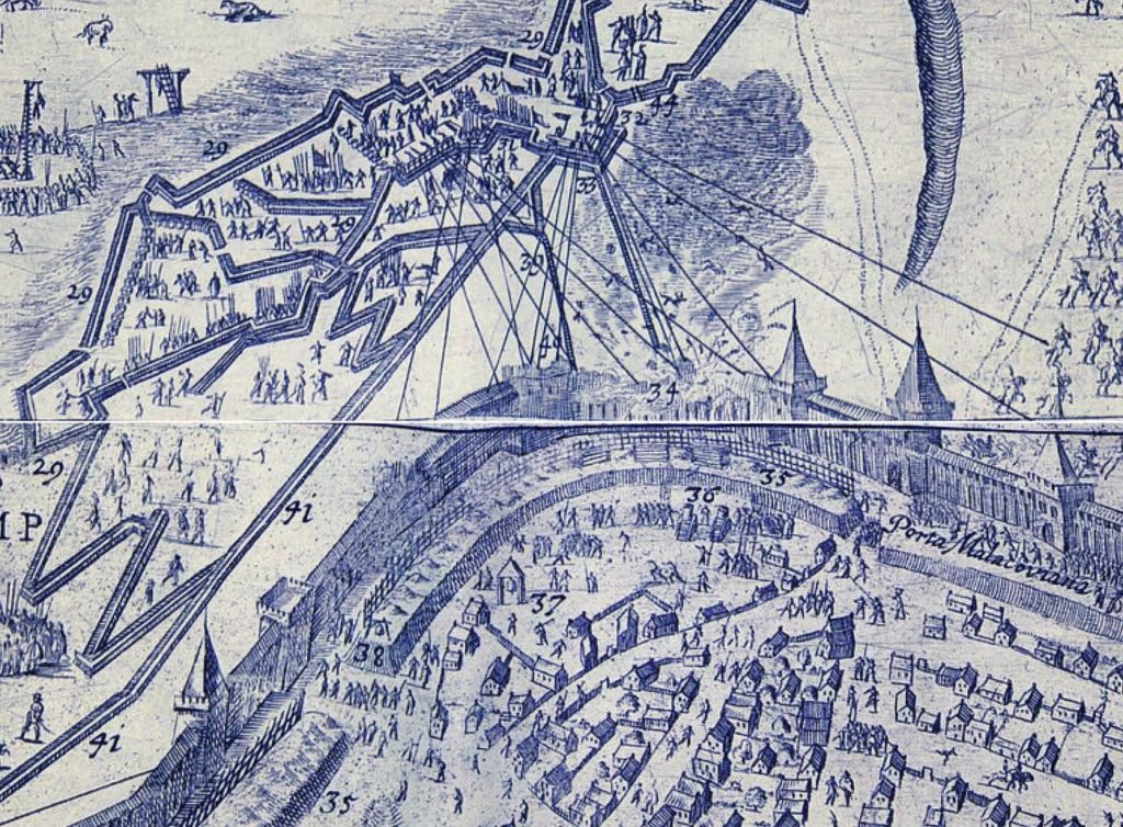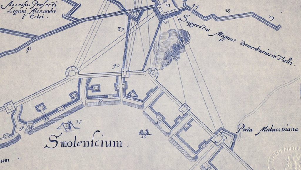 Заслуга Арцишевского в том, что он идеально сочетал оборонительные возможности вала и каменной стены, разбив пространство между валом и стегой на отсеки с помощью т.н. тарасов (срубов с землей), устроив засеки, укрепив тын на валу, расставив на нем артиллерию. Все это хорошо видно на гравюре Гондиуса, фрагмент которой мы здесь видим. И было это сделано до Смоленской войны, загодя.