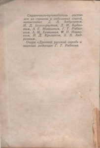 “Справочник-путеводитель составлен из справок и отдельных статей, написанных Д, А. Авдусиным, И. Д. Белогорцевым, Д. И. Будаевым, А. Е. Минкиным, Г. Т. Рябковым, А. М. Хенкиным, И. П. Ивановым, И, Д. Кроликом, Н. В. Андреевым.