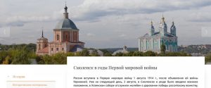 «Россия вступила в Первую мировую войну 1 августа 1914 г., после объявления ей войны Германией. Уже на следующий день, 2 августа, в Смоленске и уезде было введено военное положение, в Успенском соборе отслужили молебен о даровании победы российскому воинству, а вечером в городе прошла многолюдная манифестация. …