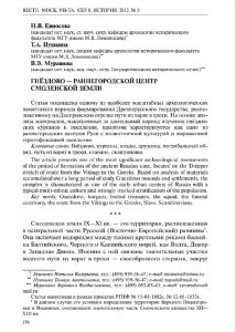 «Статья посвящена одному из наиболее масштабных археологических памятников периода формирования Древнерусского государства, расположенному на Днепровском отрезке пути из варяг в греки. На основе анализа материалов, накопленных за длительный период изучения гнёздовских курганов и поселения, памятник характеризуется как один из раннегородских центров Руси с полиэтничной культурой и выраженной стратификацией населения. …