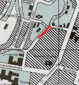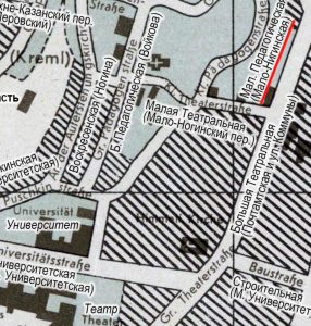 Попавшая в кадр 1-го сверху снимка часть южного участка ул. Мало-Ногинской (Kl.PädagogenStraße) выделена красной линией: