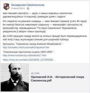 А вот дарагія сябры из паблика Беларуская Смаленшчына в посте от 9 июля 2016 г. почему-то уверенно утверждают, что автором «Исторического очерка Смоленска» является «Іван Іванавіч Арлоўскі — адзін з самых вядомых смаленскіх дарэвалюцыйных гісторыкаў, грамадзкі дзяяч, пэдагог» и даже предлагают ссылку для скачивания файла “Орловский И.И. – Исторический очерк Смоленска.pdf”, в процессе какового скачивания трансформирующийся в файл Orlovskiy_I_I_-_Istoricheskiy_ocherk_Smolenska.pdf, 3,6 MiB.