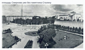 “Памятник Сталину стоявший напротив кинотеатра Октябрь, рассматривает площадь им. Смирнова”. “Площадь Смирнова уже без памятника Сталину”.