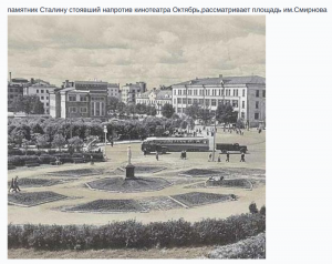 “Памятник Сталину перед к/т Октябрь установили в 1949 году. 5 марта 1963 года, мы дети , вместе со взрослыми,собравшимися стихийно слушали у памятника сообщение о смерти вождя, …”