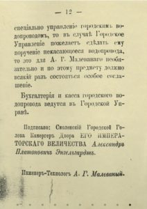 2.1. СМУП «Горводоканалу» 125 лет!, Ася ВАСИЛЕВИЧ (по информации пресс-службы Администрации г.Смоленска), «Смоленская народная газета», 3.04.2014 18:38 «…Инженер-технолог А.Г. Малеваный был назначен первым директором Смоленского городского водопровода. В штате было 6 человек: машинист, помощник машиниста, слесарь, старший кочегар, младший кочегар и «один грамотный и с водопроводным делом знакомый приказчик».