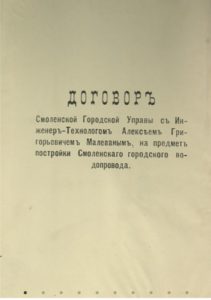 …Водоснабжение Смоленска на протяжении многих веков в основном представляло собой родники и ключевые источники подземных вод. На их базе и был построен первый примитивный водопровод в городе. Вопрос о создании настоящего водопровода встал лишь в XIX веке. Тогдашняя городская Дума не раз рассматривала этот вопрос в период с 1862 по 1889 год. В 1889 году Городская Управа, руководствуясь постановлением городской Думы от 3 апреля 1889 года и заключением избранной Думой комиссии 19 апреля 1889, заключает договор с инженером-технологом Алексеем Григорьевичем Малеванным. Он должен был построить городской водопровод в левобережном городе. Воду решено было брать из ключа в районе